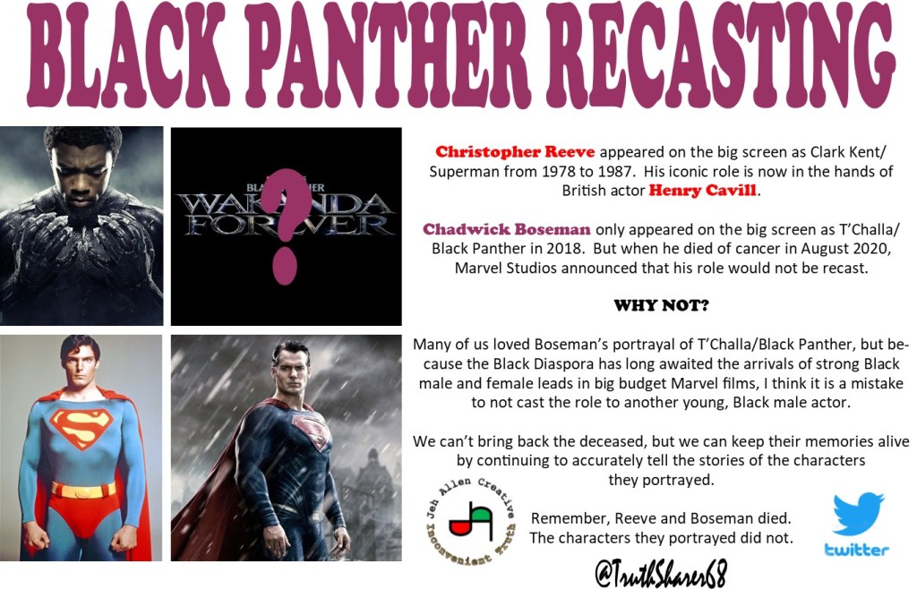 Many of us loved Boseman’s portrayal of T’Challa/Black Panther, but because the Black Diaspora has long awaited the arrivals of strong Black male and female leads in big budget, superhero films, I think it is a mistake to not cast the role to another young, dark-skinned, Black male actor.
